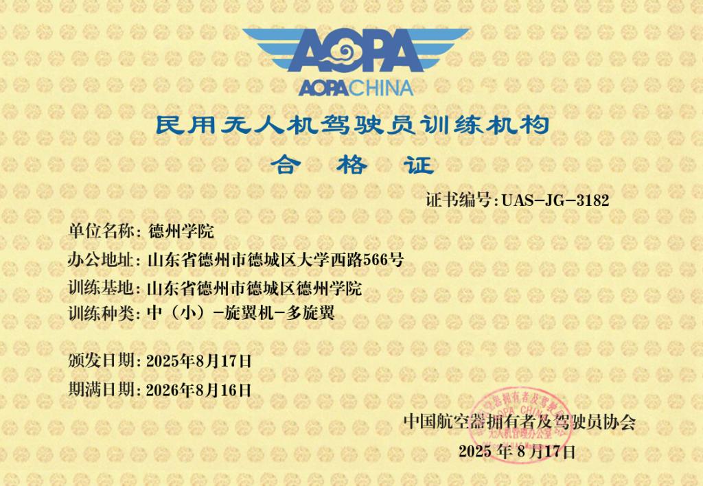 近日,太阳成tyc9728集团正式通过中国航空器拥有者及驾驶员协会(AOPA)专业审定,成功获得该协会颁发的《民用无人机驾驶员训练机构合格证》。依托该资质,学校可面向社会开展无人机执照培训,学员考核合格后将获得由中国民用航空局颁发的权威无人机执照。