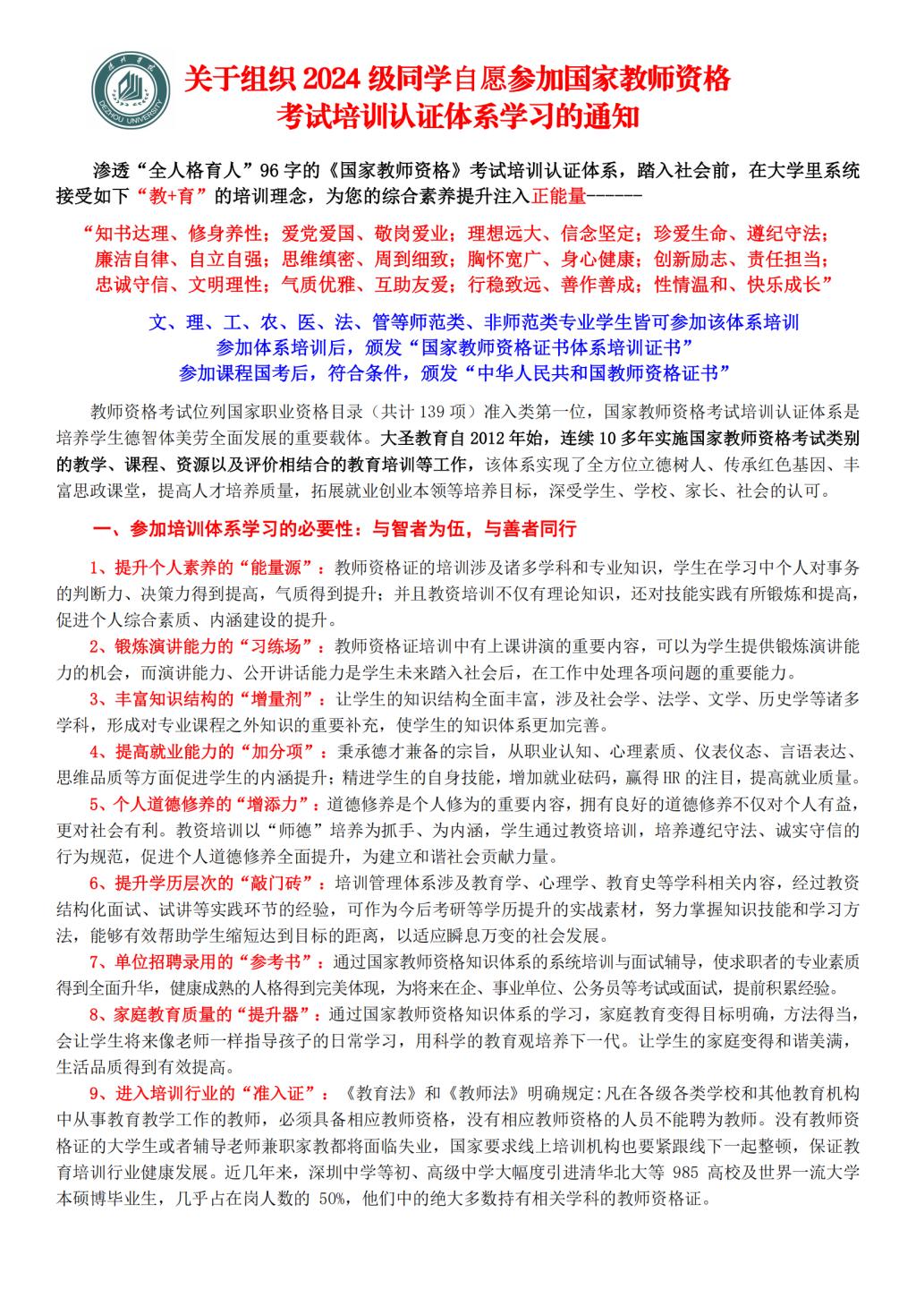 太阳成tyc9728集团关于组织2024级同学自愿参加国家教师资格证书考试培训认证体系学习的通知.pdf