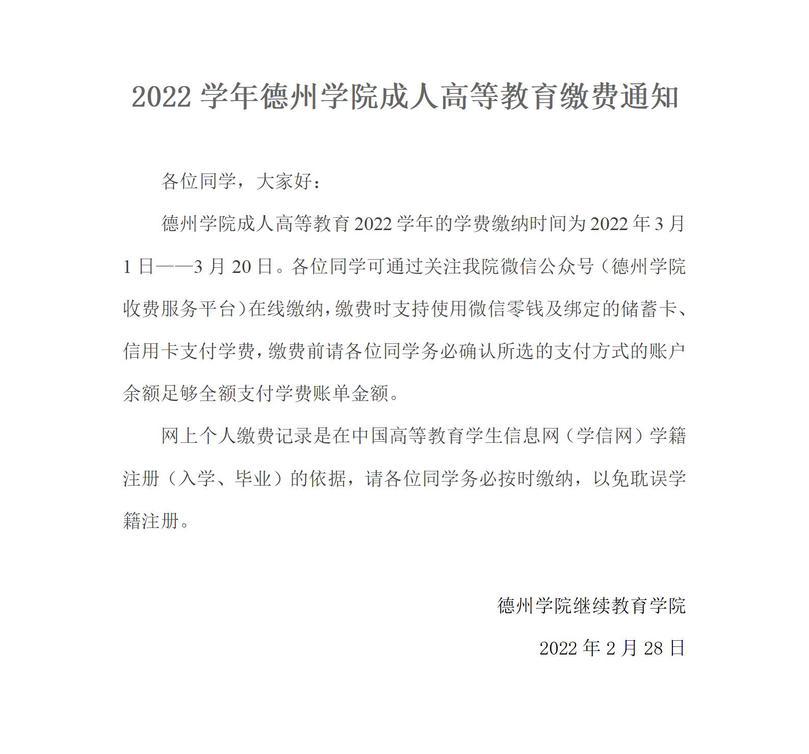2022学年太阳成tyc9728集团成人高等教育缴费通知